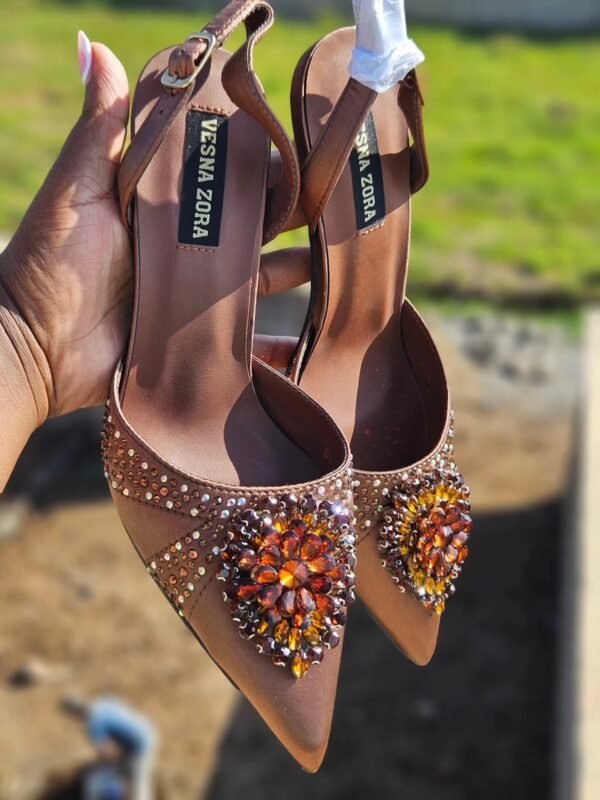 Each pair of Vesna Zora heels showcases intricate rhinestone detailing and a bold floral crystal design on the front, making them ideal for weddings, evening occasions, and elegant events. The adjustable slingback strap ensures a secure fit, while the soft inner lining offers comfort throughout the day.